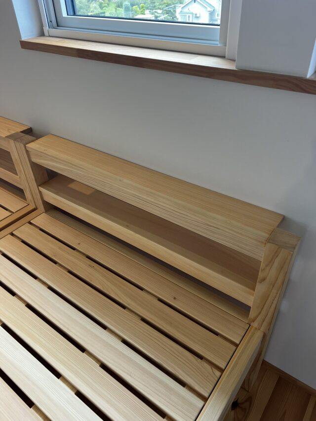 小さいな棚付きのベッドフレーム。
